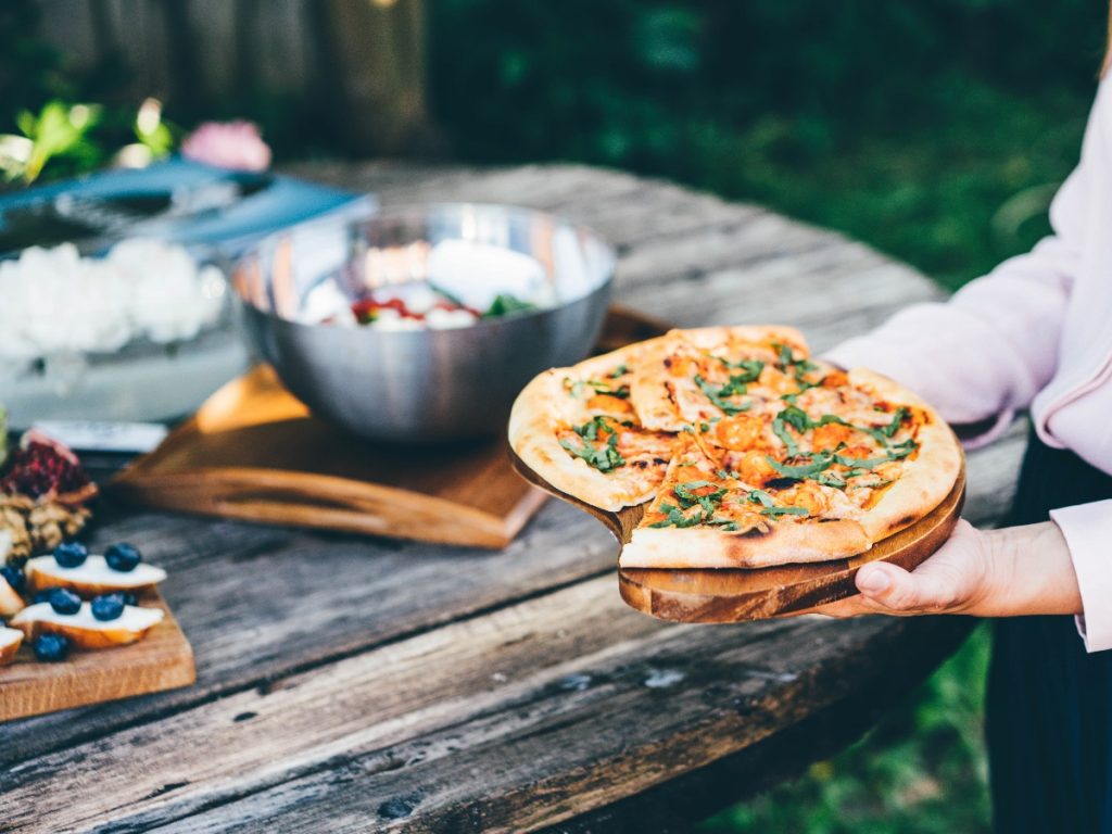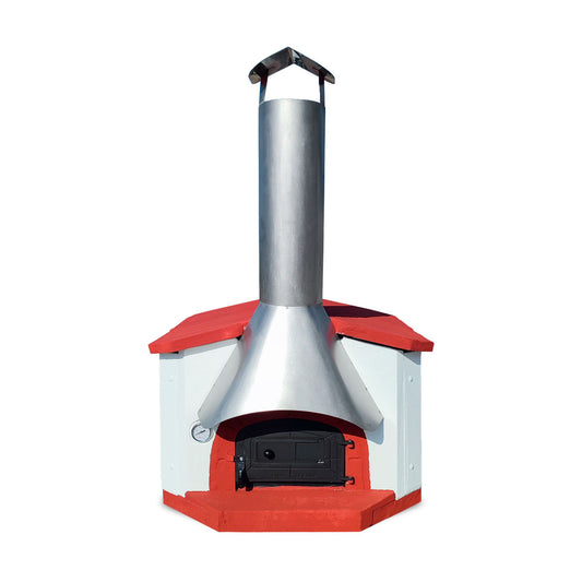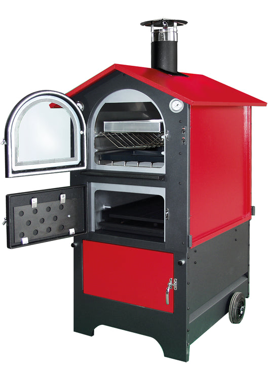 Four de jardin avec revêtement métallique pour la cuisson directe des pizzas. Grille circulaire en aluminium pour une chaleur uniforme, plaque de cuisson réfractaire pour une cuisson rapide et des pizzas savoureuses en quelques minutes.